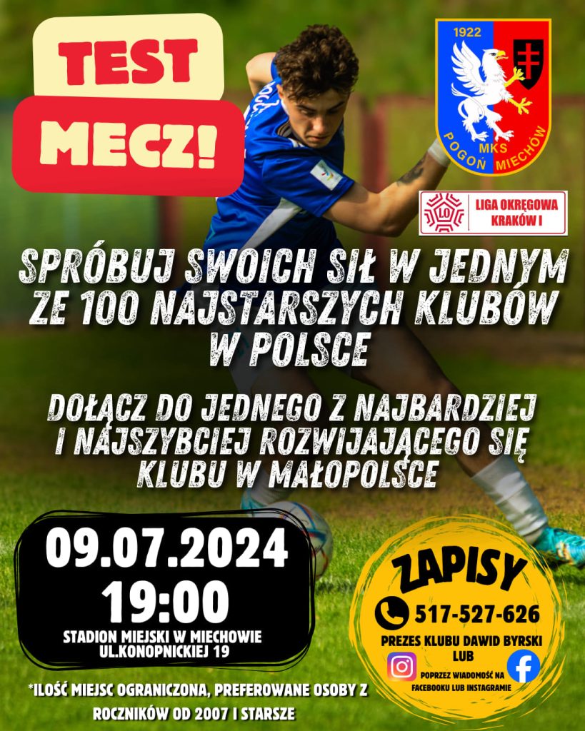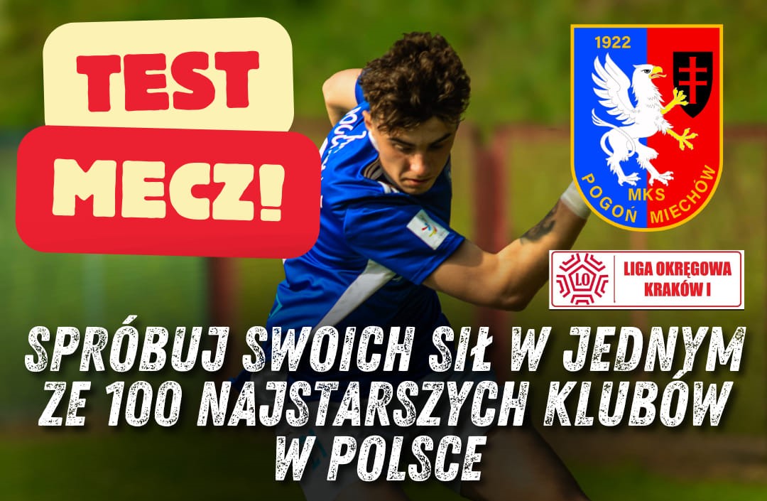 Miejski Klub Sportowy Pogoń Miechów zaprasza wszystkich chętnych piłkarzy do spróbowania swoich sił w test meczu, który odbędzie się już 9 lipca o godzinie 19:00 na stadionie przy ul. Konopnickiej 19 w Miechowie. Ty też możesz dołączyć do wielkiej piłkarskiej rodziny, więc nie czekaj i spróbuj swoich sił w jednym z najstarszych klubów w Polsce.
